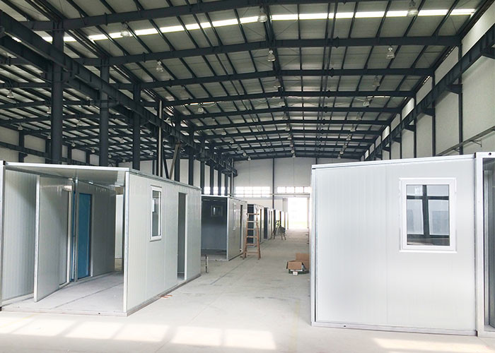 Les panneaux muraux sont en panneau sandwich PSE de 50 mm avec une densité de mousse EPS de 10 kg. Tous les panneaux sont fixés en usine et articulés avec un panneau de toiture. L'épaisseur de l'acier pour le panneau est de 0,35 mm à l'extérieur et de 0,35 mm à l'intérieur.