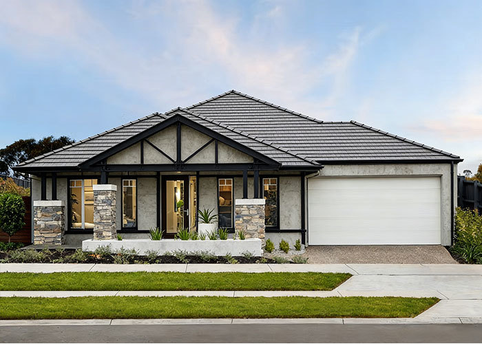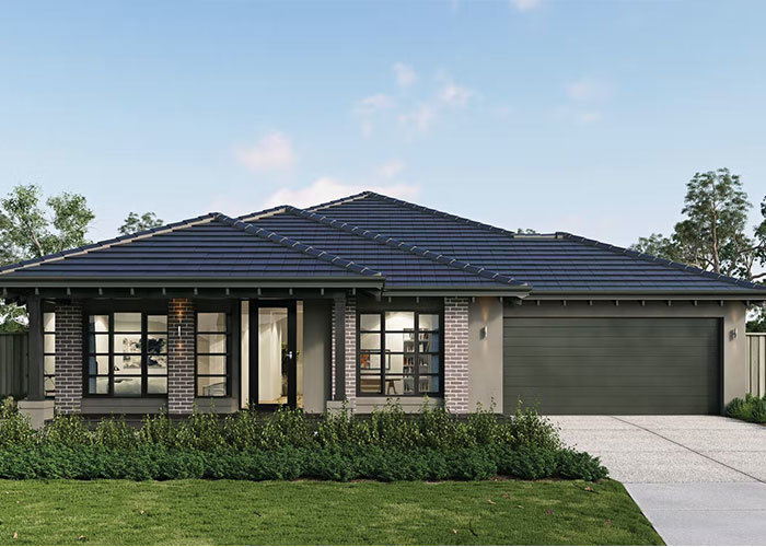 La maison Reims est une maison individuelle de plain-pied conçue pour le confort et la vie quotidienne. L'entrée est marquée par un porche accueillant qui donne à la façade une présence calme et élégante. Sur le côté droit de la maison, il y a un garage assez grand pour deux voitures, offrant un accès direct et pratique à la maison.