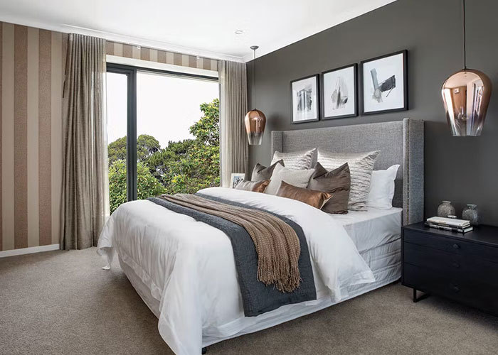 Un escalier mène au deuxième étage, où se trouvent les chambres familiales privées. Ce niveau comprend trois chambres à coucher et une salle de bain, disposées pour équilibrer l'intimité avec une circulation efficace.Le niveau supérieur fonctionne bien pour les familles., offrant des espaces privés pour dormir tout en gardant tout le monde au même étage.